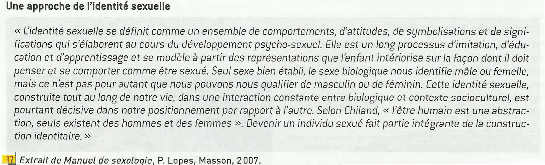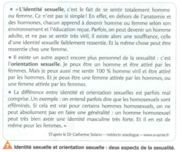 Dans ce manuel, la notion d’identité de genre n’apparaît que dans un court document intitulé « Identité sexuelle et orientation sexuelle : deux aspects de la sexualité ». Il s’agit d’extraits de citation d’une médecin sexologue.